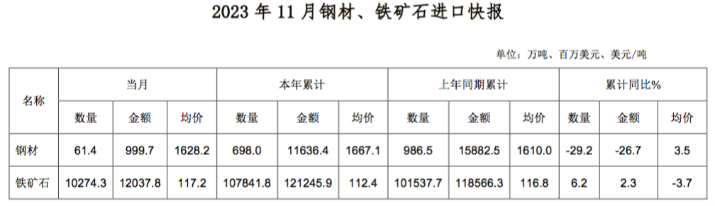 根據(jù)海關(guān)統(tǒng)計(jì)快訊數(shù)據(jù),2023年11月,我國(guó)進(jìn)口鋼材61.4萬(wàn)噸,環(huán)比減少5.4萬(wàn)噸,降幅8.1%;均價(jià)1628.2美元/噸,環(huán)比上漲111.1美元/噸,漲幅7.3%。1-11月累計(jì)進(jìn)口鋼材698.0萬(wàn)噸,同比減少288.5萬(wàn)噸,降幅29.3%。